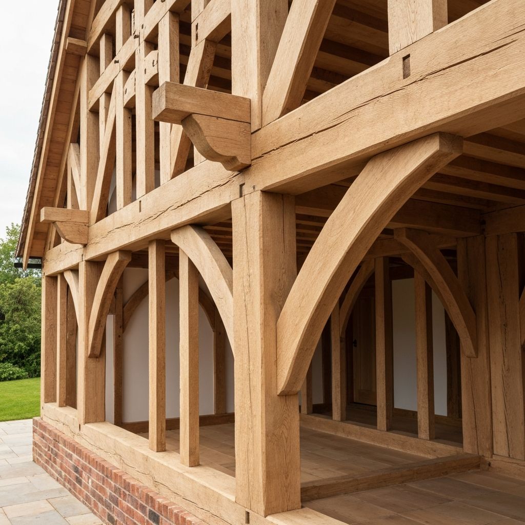 Traditional oak timber framing for structural and decorative applications. Expert craftsmanship in period-appropriate construction techniques.